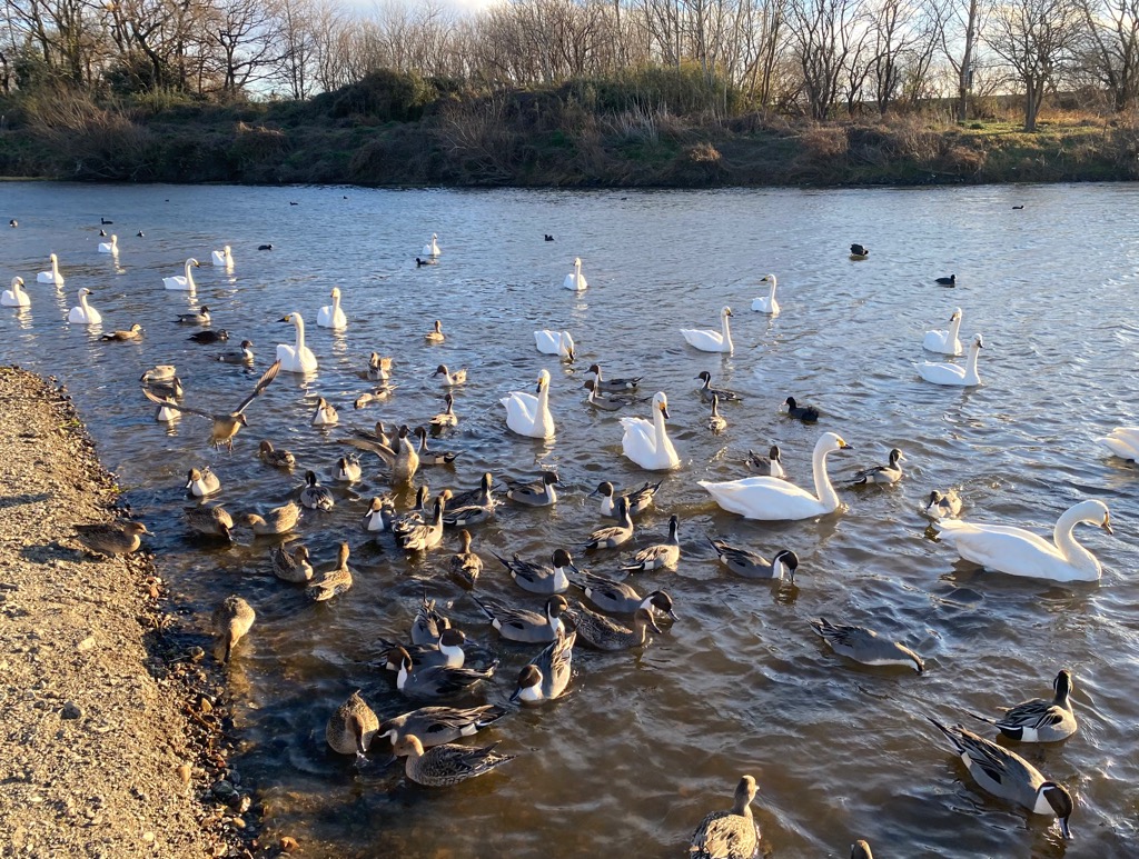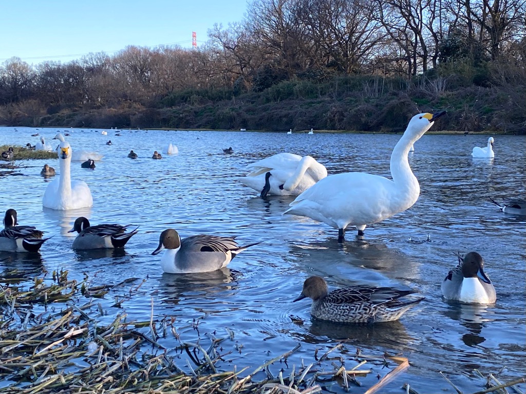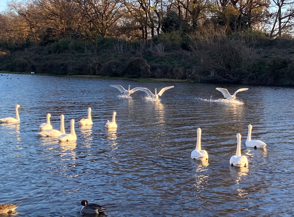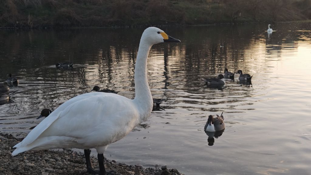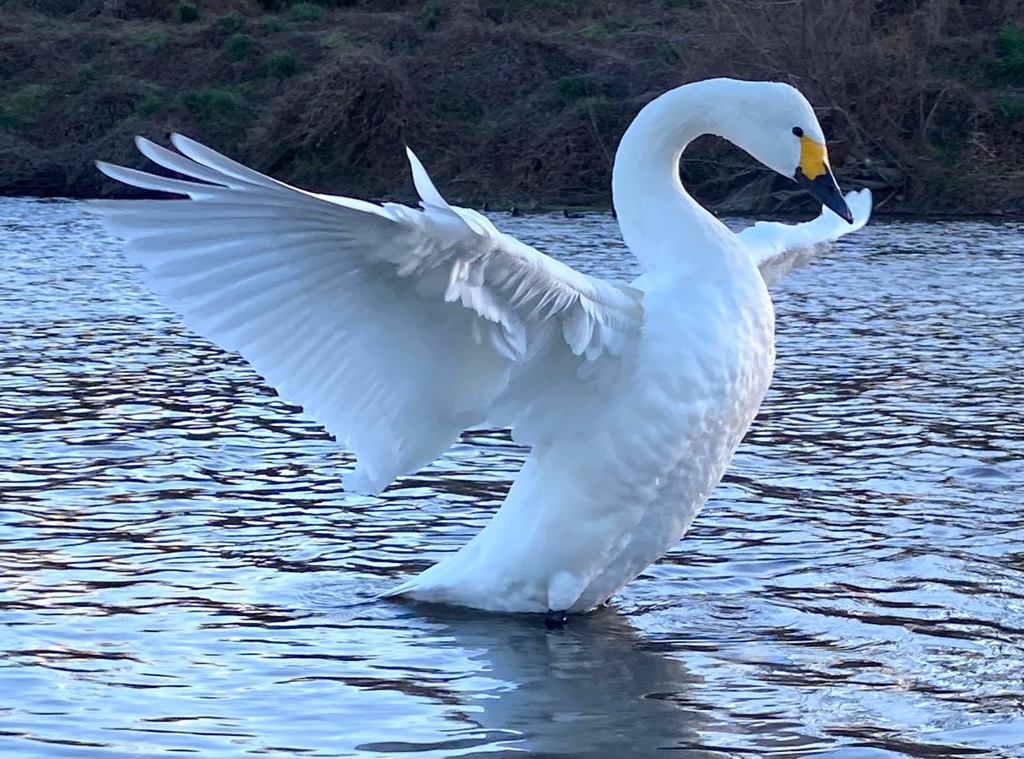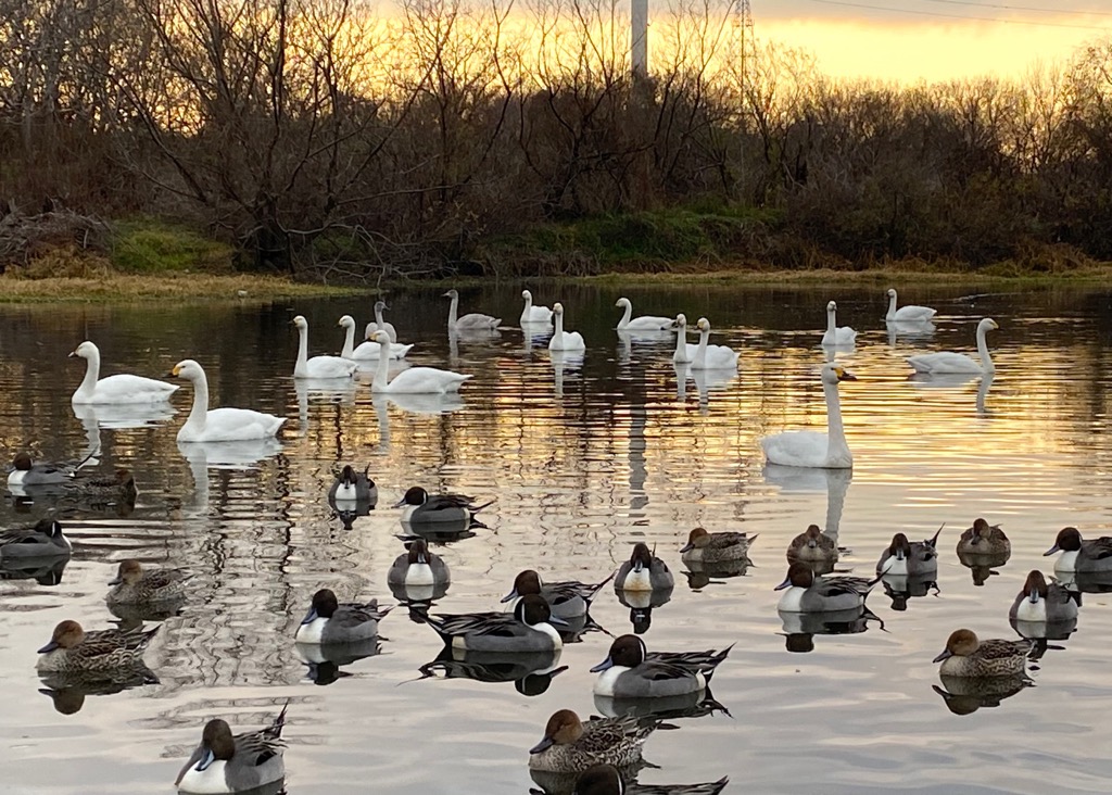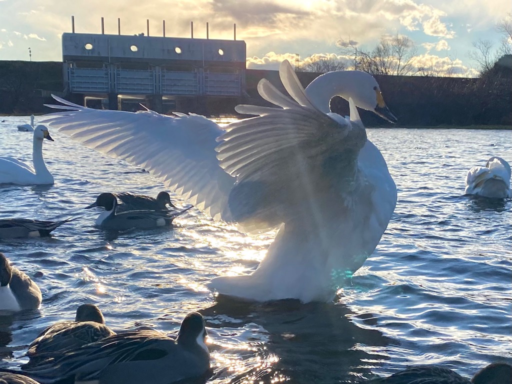 白鳥は、基本的には 早朝(午前7時くらいまで)と夕方(午後4時くらい)に飛来地で見ることができます。日中は、エサを食べにあちこちに飛び立っているため、飛来地ではあまり見られません。(野生の鳥なので、上記の時間はあくまでも目安です。日中に見られることもあります。)