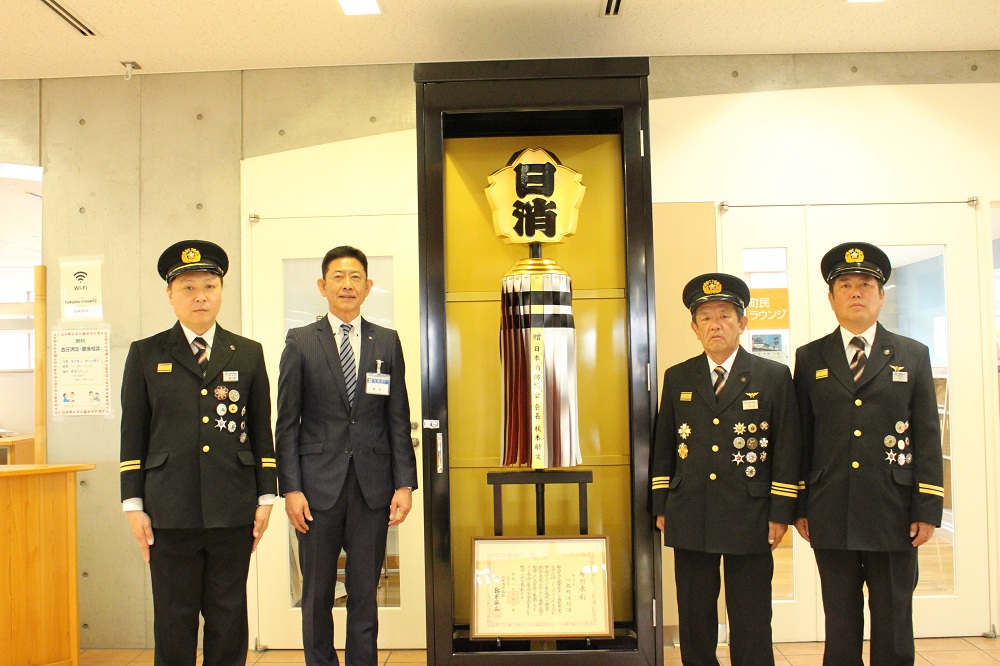 (左から、高野団長、藤間町長、笹岡前団長、間下副団長)
