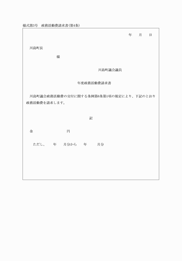 第1条 この規則は、川島町議会政務活動費の交付に関する条例(平成13年川島町条例第3号。以下「条例」という。)に基づく政務活動費の交付に関し必要な事項を定めるものとする。