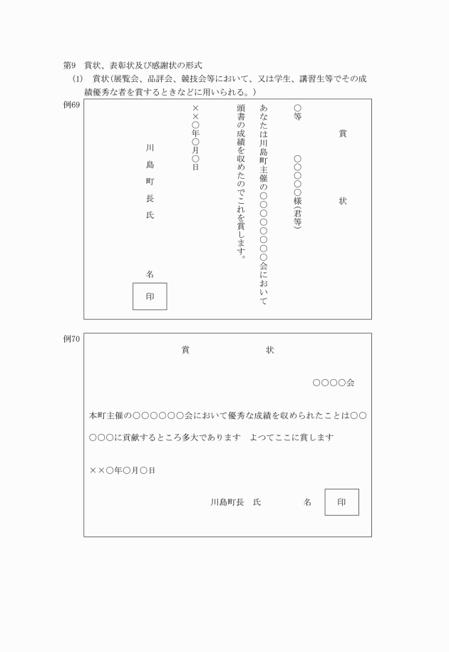 (1) 文体は、原則として「である」体を用い、普通文書、賞状、表彰状、感謝状等については、なるべく「ます」体を用いること。