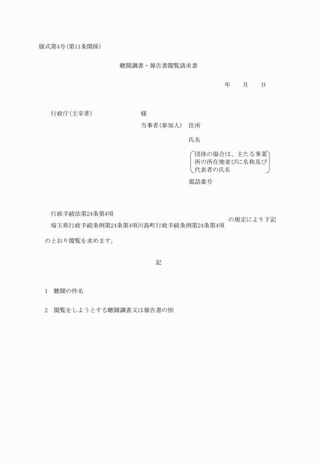 第11条 法第24条第4項の規定による聴聞調書又は報告書の閲覧の請求は、行政庁(聴聞の終結前に聴聞調書の閲覧を求めようとする場合にあっては、主宰者)に様式第4号の請求書を提出して行うものとする。