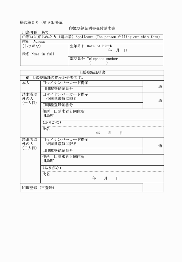 第2条 条例第3条の規定による印鑑の登録申請は、印鑑登録申請書を町長に提出して行うものとする。