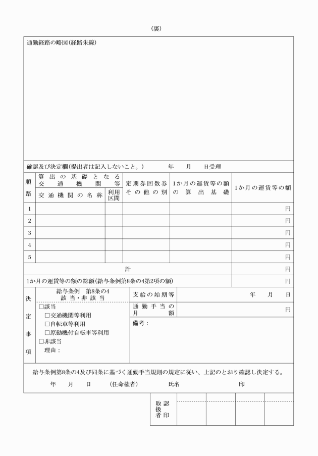 第4条 任命権者は、職員から前条の規定による届出があったときは、その届出に係る事実を通勤用定期乗車券(これに準ずるものを含む。)(以下「定期券」という。)の掲示を求める等の方法により確認し、その者が給与条例第8条の4第1項の職員たる要件を具備するときは、その者に支給すべき通勤手当の額を決定し、又は改定しなければならない。