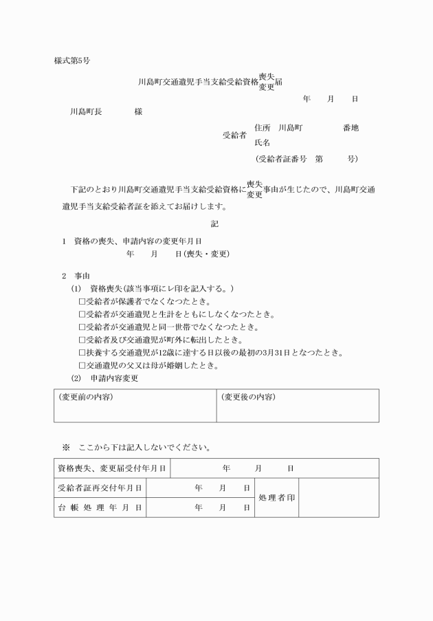 第1条 川島町交通遺児手当支給条例(昭和50年川島町条例第23号。以下「条例」という。)第4条第1項の規定により、受給資格の認定を受けようとする者は、川島町交通遺児手当支給受給資格認定申請書(様式第1号。以下「申請書」という。)を町長に提出しなければならない。