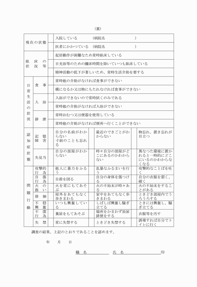 1 起居動作が困難なため、常時臥床している。 2 日光浴等のための離床時間を除き、いつも臥床している。 3 精神活動の低下が著しいため、常時生活介助を要する。 | 1 常時他の介助がなければ、食事ができない。 2 横になるか、又は物にもたれなければ、食事ができない。 3 入浴ができないので、身体を常時拭くのみである。 4 常時他の介助がなければ、入浴できない。 5 常時おむつ又は便器を使用している。 6 常時他の介助がなければ、便所へ行くことができない。 |