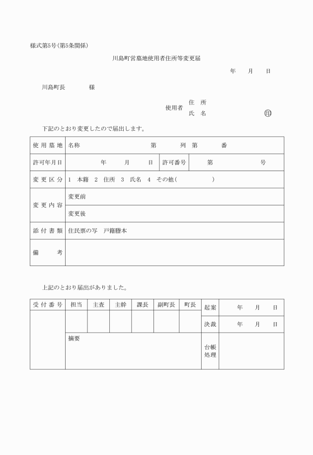 第5条 墓地の使用許可を受けた者は、住所又は氏名に変更が生じたときは、速やかに様式第5号の変更届に当該事実を証する書類を添えて町長に提出しなければならない。