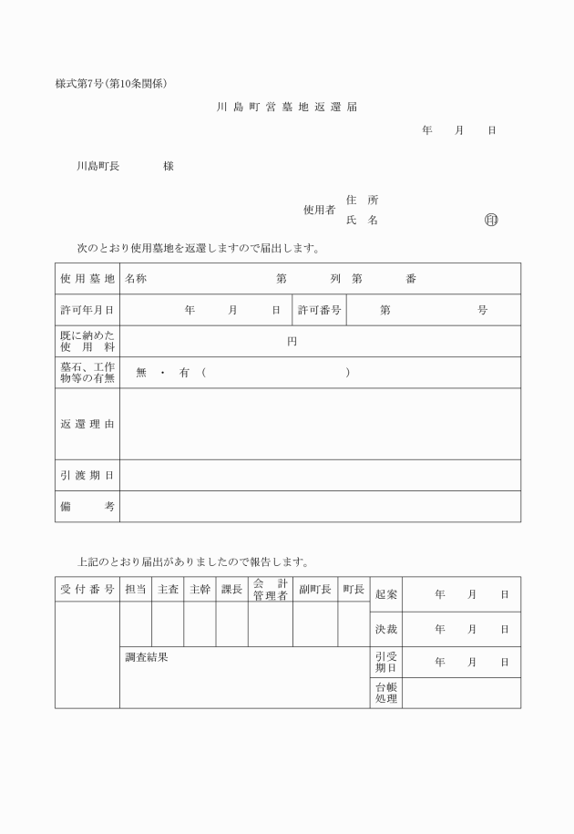 第10条 墓地の使用許可を受けた者が、当該墓地を返還しようとするときは、様式第7号の返還届に使用許可証を添えて町長に提出するものとする。