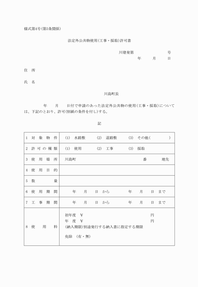 第2条 条例第4条第1項前段の規定に基づき許可を受けようとする者は、法定外公共物使用(工事・採取)許可申請書(様式第1号)2通を町長に提出しなければならない。