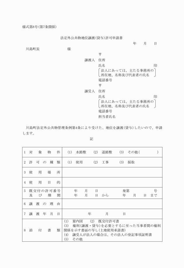 第3条 条例第4条第1項後段の規定により使用の許可を受けた者が変更の許可を受けようとするときは法定外公共物使用(工事・採取)変更許可申請書(様式第2号)2通を町長に提出しなければならない。