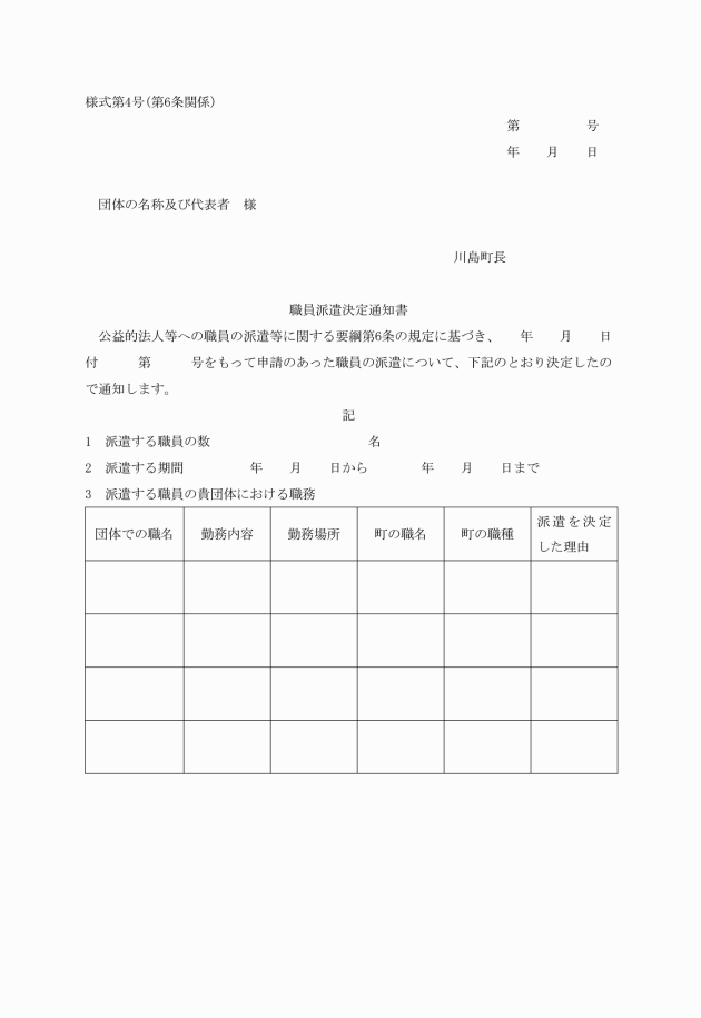 第3条 職員の派遣を申請しようとする団体の代表者は、派遣を希望する職員の勤務内容及び勤務場所を明確にした上で、職員派遣申請書(様式第1号)に、当該団体の実施する事業及び組織の状況等が把握できる書類を添付して、町長に申請するものとする。