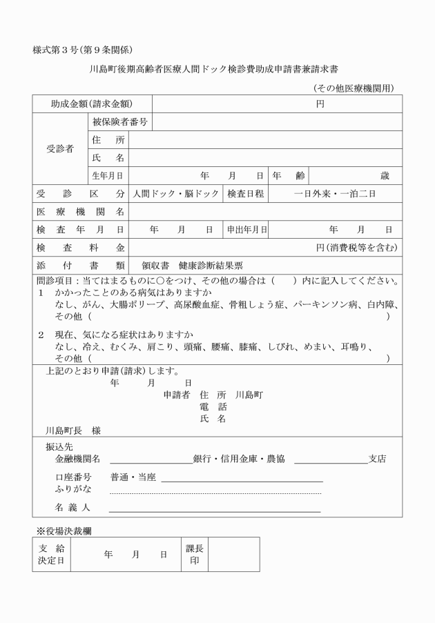 第4条 この告示に基づいて、町が委託した医療機関(以下「指定医療機関」という。)で人間ドックを受けようとする者は、川島町後期高齢者医療人間ドック検診費助成申請書(様式第1号)に必要事項を記入のうえ被保険者証を添えて町長に提出するものとする。