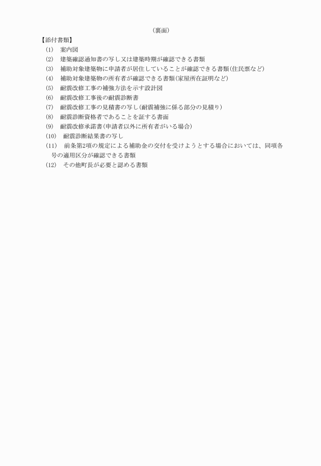 第7条 補助金の交付を受けようとする補助対象者(以下「申請者」という。)は、耐震改修工事施行前に川島町既存木造建築物耐震改修補助金交付申請書(様式第1号)に次に掲げる書類を添えて、町長に提出しなければならない。