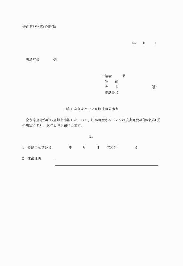 第6条 空き家登録者で、空き家登録台帳の登録を抹消したい場合には、川島町空き家バンク登録抹消届出書(様式第7号)により、町長に届け出なければならない。