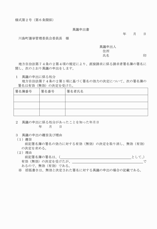 第6条 法第74条の2第4項の規定により、署名簿の署名に関し異議があるときは、同項に規定する関係人は異議申出書(様式第2号)を委員会に提出しなければならない。