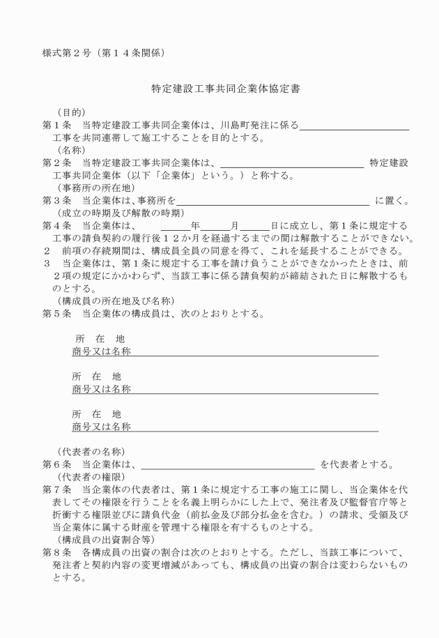 第1条 この告示は、町が発注する建設工事に係る共同企業体の取扱いについて、川島町建設工事請負等競争入札参加者の資格等に関する規程(平成19年川島町訓令第13号)に定めるもののほか、必要な事項を定めるものとする。