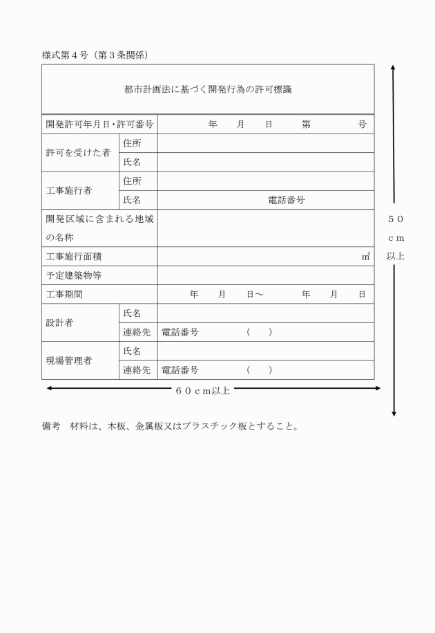 (2) 工事の現場には、都市計画法に基づく開発行為の許可標識(様式第4号)により、見やすい箇所に許可があった旨の表示をしておくこと。