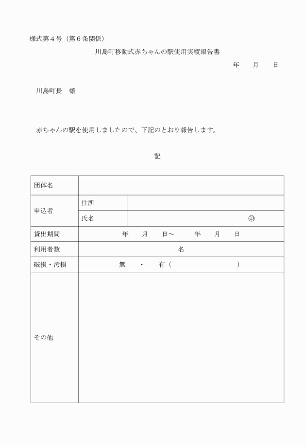 第6条 赤ちゃんの駅の貸出承認を受けた者(以下「使用者」という。)は、原則として自ら川島町子育て支援課において赤ちゃんの駅を直接借り受け、返却の際は、川島町移動式赤ちゃんの駅使用実績報告書(様式第4号)を提出し、返却しなければならない。
