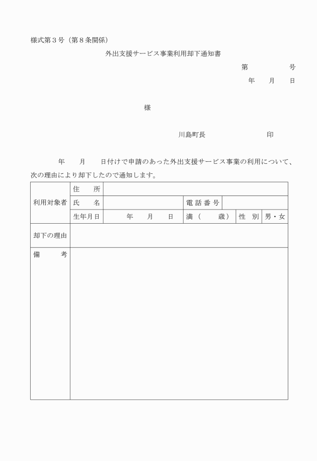 第7条 この事業を利用しようとする者(以下「利用者」という。)は、外出支援サービス事業利用申請書(様式第1号)に必要事項を記載し、町長に提出するものとする。