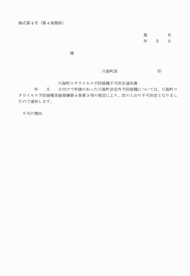 第4条 予防接種を受けようとする対象者の保護者(以下「助成対象者」という。)は、川島町ロタウイルス予防接種実施申請書(様式第1号)により町長に申請するものとする。