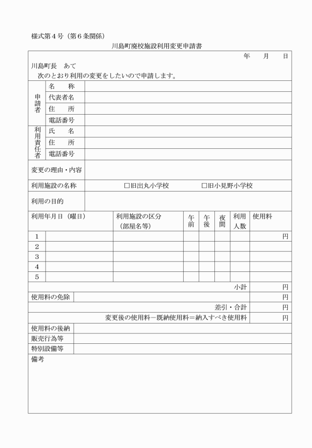 第4条 町長は、利用申請を承認するときは、川島町廃校施設利用承認書(様式第2号)(以下「利用承認書」という。)を申請者に交付するものとする。