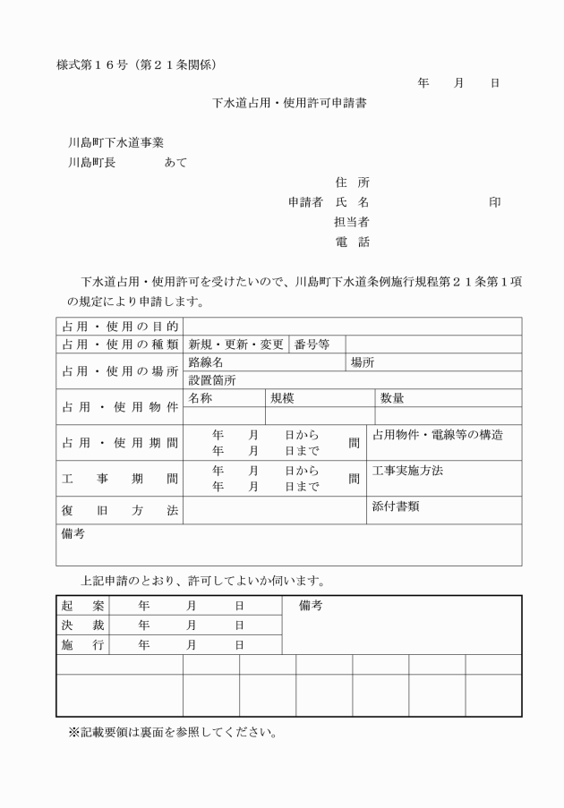 2 土木建築に関する工事の施行に伴う排水のため、公共下水道を一時使用する場合は、公共下水道一時使用申請書(様式第11号)を管理者に提出しなければならない。