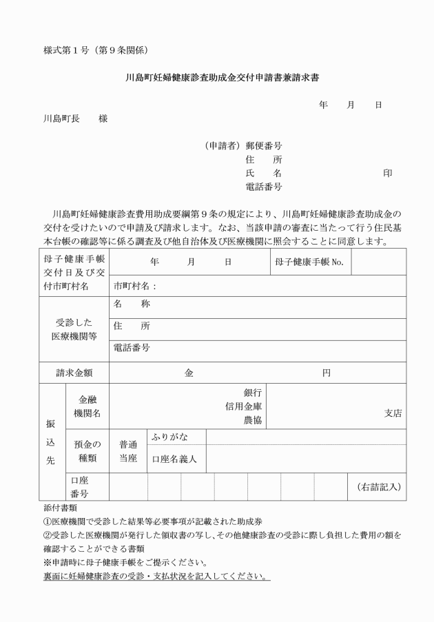 第9条 契約外医療機関で健診を受診した者は、川島町妊婦健康診査助成金交付申請書兼請求書(様式第1号)に、次に掲げる書類を添えて、健診費用に係る助成金(以下「助成金」という。)の交付を町長に申請するものとする。