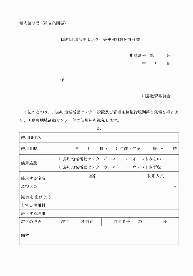 第8条 センター及び別館の使用料の減免を受けようとする者は、様式第2号により教育委員会に届出し、許可を受けなければならない。